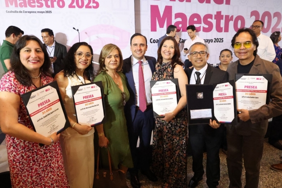Saltillo, Coahuila, 14 de mayo de 2025.– El gobernador Manolo Jiménez Salinas encabezó la entrega de preseas magisteriales a docentes