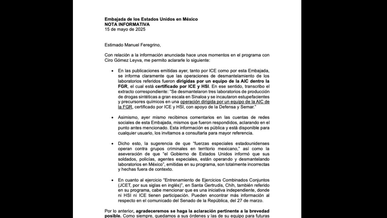 Ciudad de México, 15 de mayo de 2025.– La Embajada de Estados Unidos en México rechazó que agentes de su